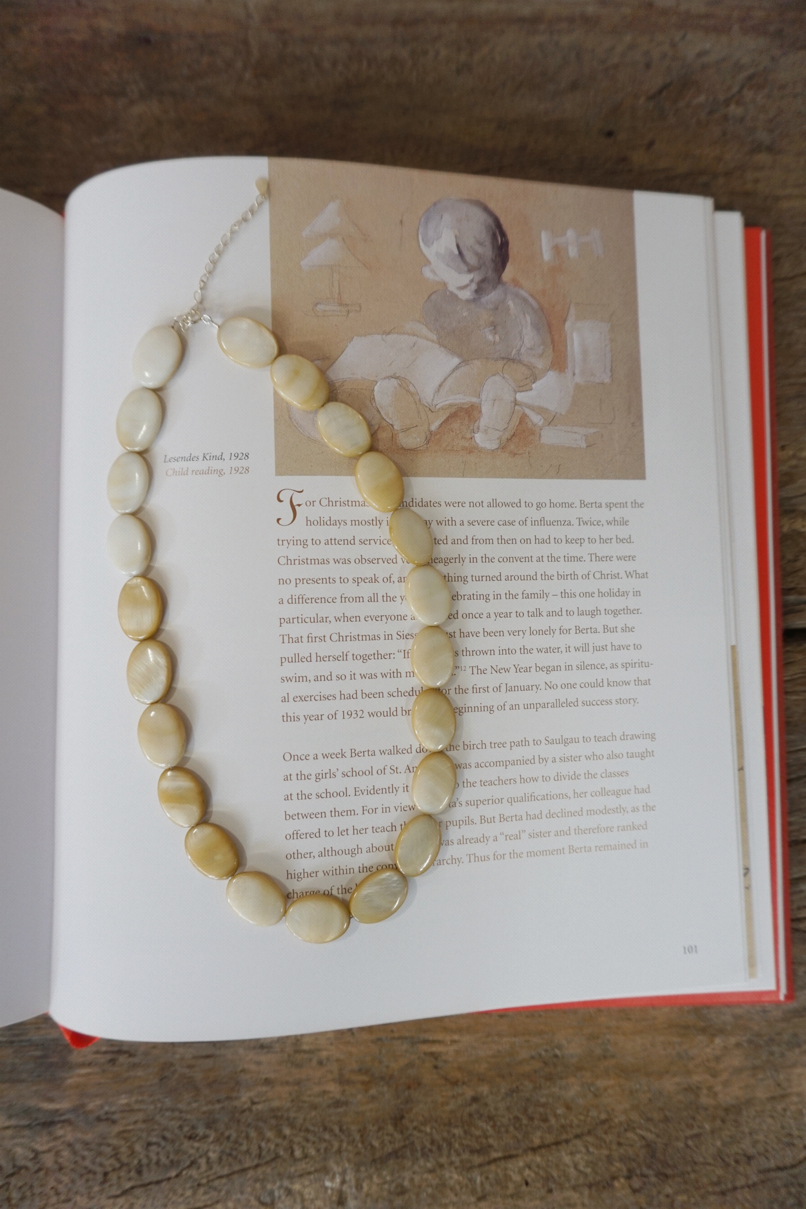 노란 자개를 납짝하게 깍아 만들어진 존재감 가득한 자개 목걸이 입니다. 독특한 포인트 악세사리로 추천드립니다.