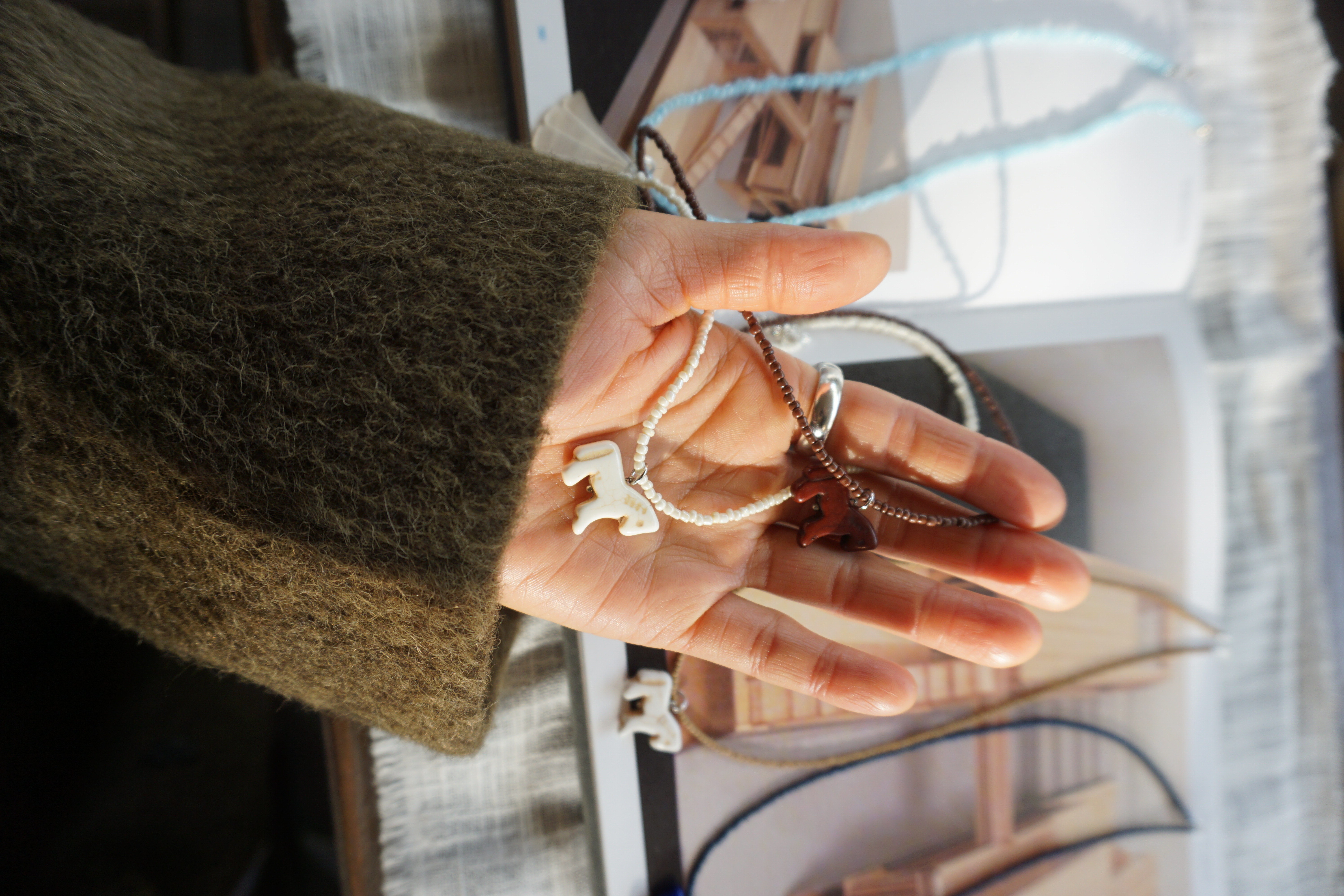 말 팬던트는 소나무처럼 변하지 않는 생명력과 장수, 돌이 지닌 단단함과 보호의 의미를 함께 담고 있는 松(소나무 송) + 石(돌 석)으로 제작했으며 모든 금속은 실버, 40cm의 비즈를 사용했습니다.